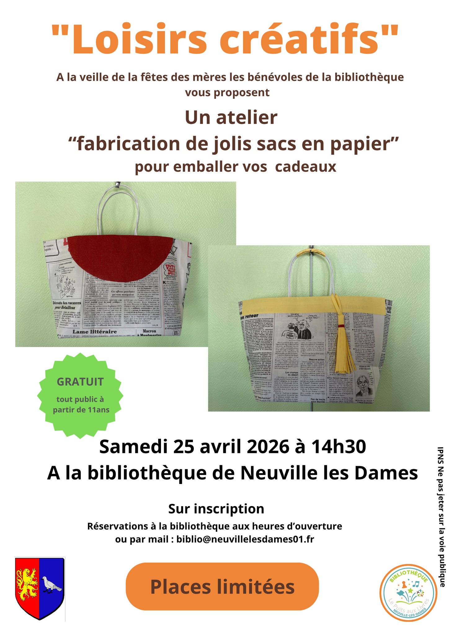 La bibliothèque de Neuville-les-Dames vous invite à un atelier convivial pour apprendre à créer de jolis sacs en papier recyclé 🎨