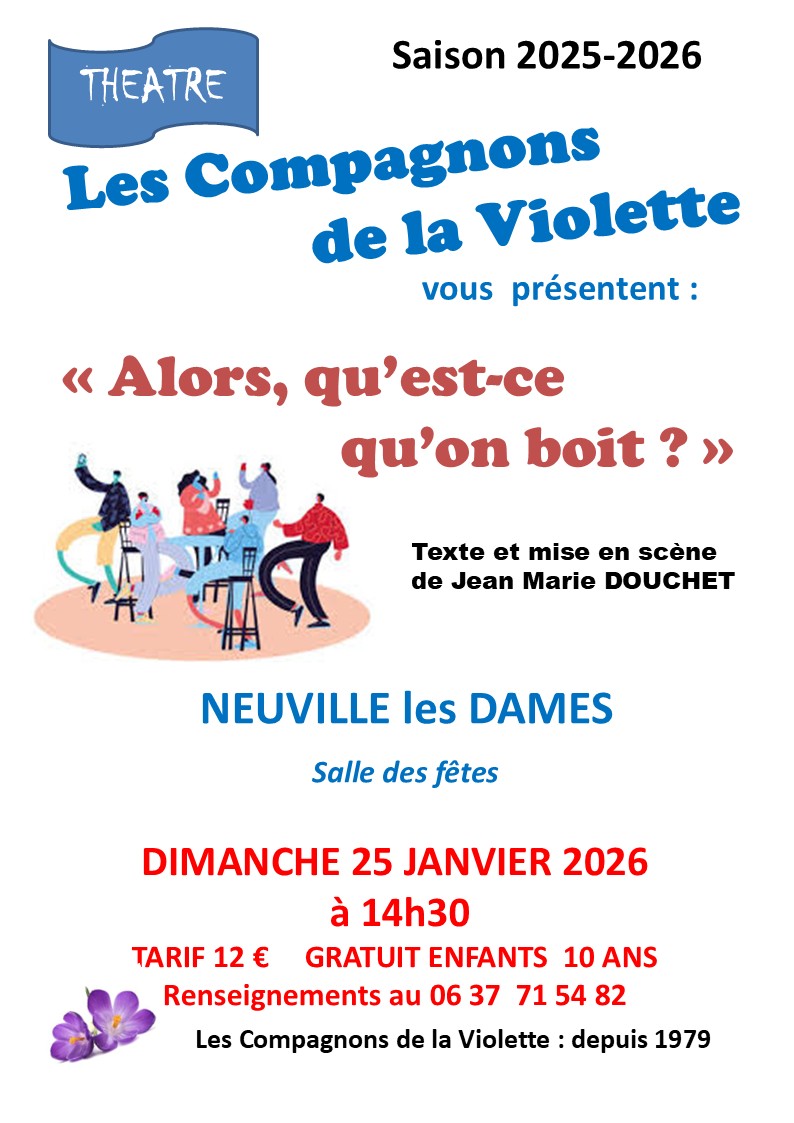 Dimanche 25 janvier 2026 à 14h30 à la salle des fêtes de Neuville-les-Dames, l’association Arc-en-Ciel propose une pièce de théâtre : “Alors qu’est-ce qu’on boit” par les Compagnons de la violette (textes et mise en scène de Jean-Marie Douchet).