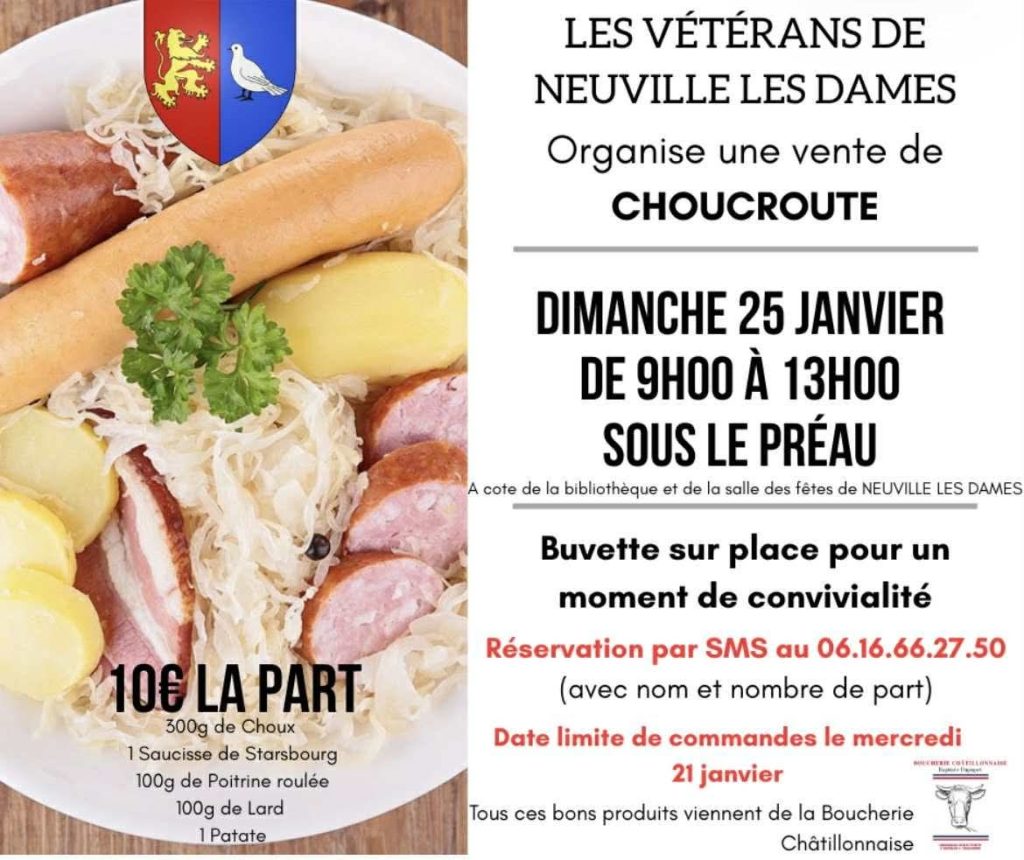 Le dimanche 30 novembre 2024 à partir de 12h à la salle des fêtes de Neuville-les-Dames, repas choucroute. Sur place ou à emporter.